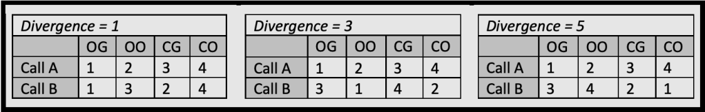 [11] An average divergence of 3.0 is what one would get by comparing calls to random calls. A higher average divergence would mean that some factor was actively pushing the calls to be more divergent than random, which would be very odd indeed.