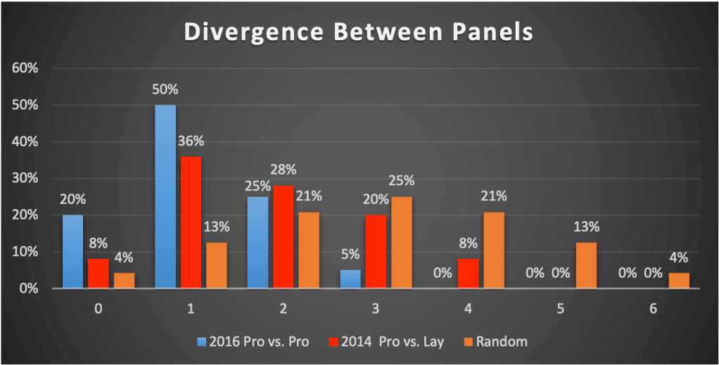 Using this method, we found that initial calls by highly qualified judges diverged from the settled opinion (i.e., the final call) of a panel of similarly qualified judges by an average of 1.60 degrees (with a standard deviation of 1.16). But while this average is neither strikingly high nor particularly low, we found that focusing on the distribution in this data was more telling. In particular, we note that 21% of these initial calls diverged by 3 or more degrees. That is to say, more than 1 out of 5 initial calls by highly qualified judges were very different from the settled opinion of a highly qualified panel (a significantly more reliable measure, as shown above).