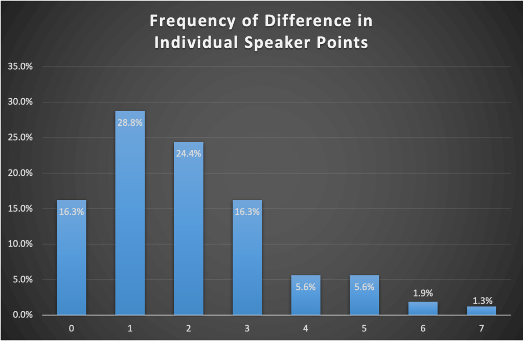 The average difference between the two panels in their assignment of speaker points to an individual was just under 2 points (1.97). The maximum difference was 7 points and standard deviation was 1.56, with the most common difference being 1 point (29% of cases). In 69.4% of cases, point assignments differed by 2 or less.