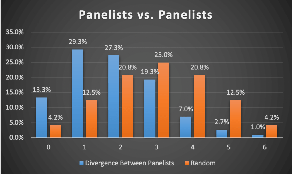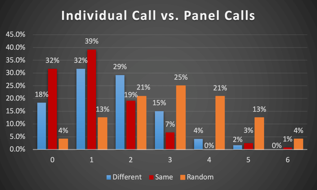 The other approach we took in evaluation individual judge calls was to compare them to the final call of the other panel (which they were not a part of). In the chart below, we again see the random distribution of call divergence in the rightmost orange columns (for reference). The blue (leftmost) columns represent the frequency of call divergence between individual calls and the other panel. The red (middle) columns represent divergence between individual calls and the judge’s own panel, which is more closely correlated, presumably because the individual making the call was one of just three people influencing that panel’s final call.[12]