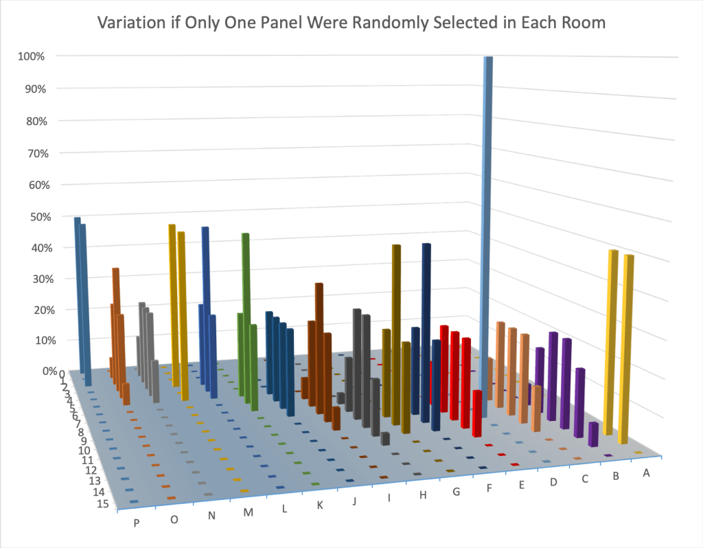 Although it was not one of our initial research goals, in the process of analyzing the data, we found another potentially illuminating way of looking at the differences between the calls of the two panels. For the sake of argument, let’s assume that every panel at the 2016 HWS RR was a highly qualified panel. The tournament would not have been criticized for having poor judging if each room had only one of the two panels that they actually had. Now, imagine that we had randomly selected only one of the two panels from each room to do the adjudication. What would the potential variations in the outcome of the preliminary rounds look like?