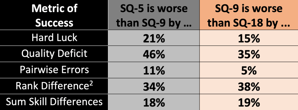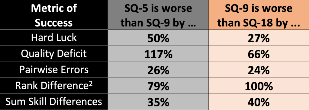 These charts show what everyone already believes: holding more rounds will improve the accuracy of the break. All of our metrics confirm this. Note that the number of deserving teams who miss the break does not actually vary that much. This is both interesting and misleading. We will return to this later, but briefly, it turns out that the real key to improving break accuracy isn’t just excluding fewer deserving teams, but getting the order of all the teams more accurately sorted so that fewer team who are very deserving are excluded and fewer teams who are very undeserving are included. The size the bubble (e.g., number of teams on 17 at a typical WUDC) also shrinks considerably as more rounds are added. All three order accuracy metrics improve considerably when you add more rounds. Table 3 how much worse the status quo (SQ) system does with fewer rounds (5 vs 9, or 9 vs 18).