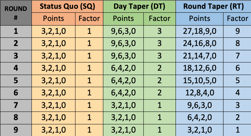 In the course of our research, we compared the results countless scoring systems. In this subsection, we compare the status quo method for 9 rounds with two new methods employed over 9 rounds. The new systems we are considering here, which are summarized in Table 5, offer more points per round at the start of the tournament and these points are reduced until the end of the preliminary rounds (Round 9), at which time they all offer the tradition points. This is similar to the annealing process described in Section 2. Points in any given round are always multiples of the standard (3,2,1,0). In the first method, represented by green in the table and charts below, these points just change day by day (“Day Taper” or “DT”). In the second method, represented by blue, the points change round by round (“Round Taper” or “RT”). Here, status quo points are multiplied by the number of preliminary rounds remaining when that round begins.