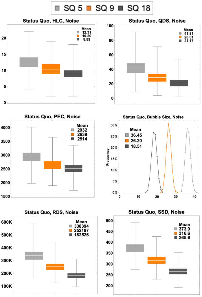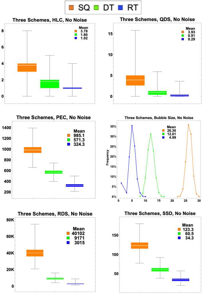 Below we present two sets of six graphs, representing our five metrics of success and the bubble size. The first set (Figures 7.1 – 7.6) is under the idealized assumption of no noise. The second set (Figures 8.1 – 8.6) assumes a realistic noise level.[15] The point here is to first establish a “proof of concept” for our approach of using tapered points, using an idealized environment, and then show that these results hold under realistic conditions.