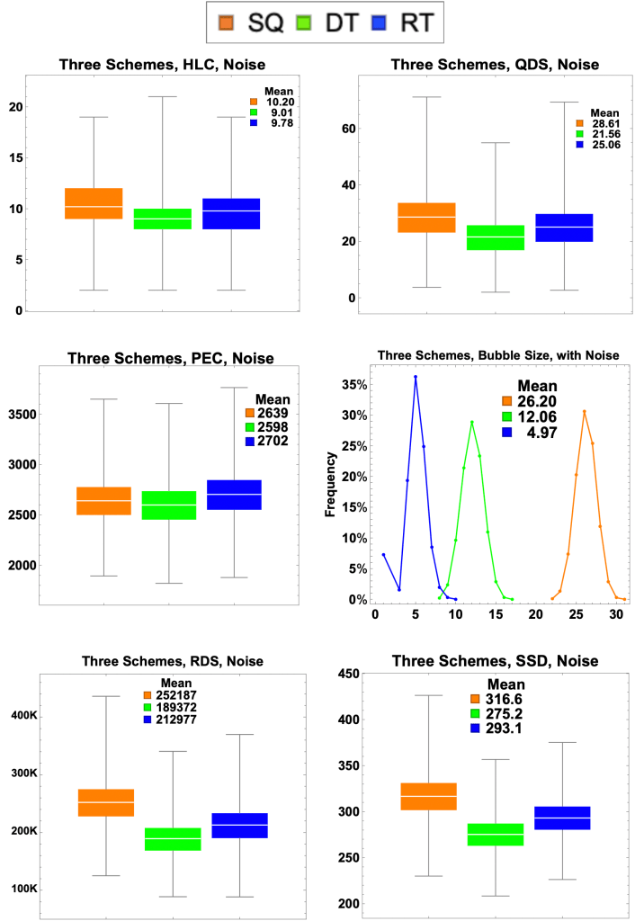 Predictably, all of the systems average much less accurate breaks when we add noise, but the new DT system still does better than the SQ on all metrics (though by smaller margins) and RT does better on all but one metric. With realistic noise in the simulation, the advantages of the new systems are less dramatic, but they certainly still exist. Notably, the DT system does better than the RT system when there is noise.[16] Both tapered systems outperform the SQ, but the DT system is most clearly superior. Only the pairwise error count metric has the three different scoring systems roughly on par, but DT still performs better, and given its dramatic superiority on the other metrics, this does not concern us.