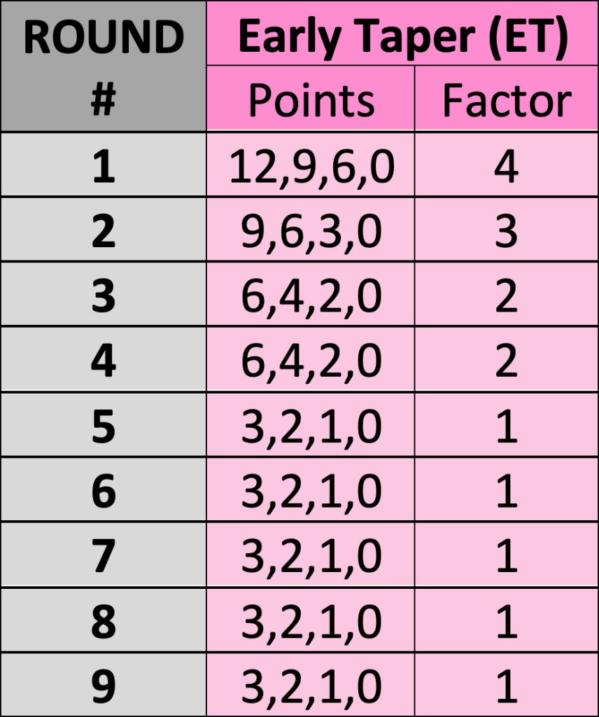 [20] In the Early Taper system, the last five rounds award points just like the status quo system.