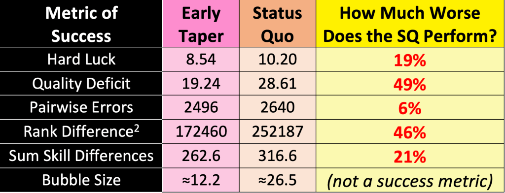 As we noted in Section 6.1, running double the number of preliminary rounds definitely makes the break more accurate. But even running 18 rounds of SQ generates less accurate breaks than running an Early Taper system for just 9 rounds. In short, the WUDC community can achieve a break accuracy better than holding 18 preliminary rounds if they simply change how points are awarded in the first four rounds of the tournament, with no other changes necessary.[20]