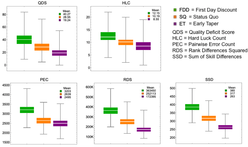 Out of this same set of concerns arises an objection to tapered scoring. The objection is based on two empirical premises. First, because of the various impacts of global injustice, EAD teams tend to be less well prepared for competition at Worlds (e.g., they are less familiar with typical WUDC judging standards). Second, because of this, EAD teams will tend to do worse in early rounds, but their performance quality increases at a faster rate than non-EAD teams during the tournament. We will call this the “gap closing” premise. It would be useful to have data that might support or refute these empirical premises, but they are prima facie plausible enough to take very seriously. Indeed, the first premise seems obviously true and is consistent with the data we see in WUDC results.[12] But the key to the objection is the gap closing premise. It seems to follow from the gap closing premise that EAD teams would perform better with SQ scoring (where early rounds are less influential) even if overall break accuracy were improved by using ET. Of course, the objection here is not that tapered scoring is intended to harm EAD teams, just that it has this unfortunate side effect.