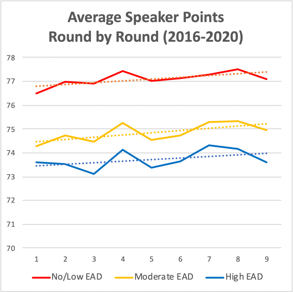 Of course, our analysis here is not conclusive. It is possible that a larger or more sophisticated analysis would show a more dramatic closing of the gap by EAD teams. But, as things stand, the gap closing premise is not a compelling empirical foundation for an objection to tapered scoring. Even if it turns out to be technically true that the performance gap does close, the magnitude of that closure (a tenth of a speaker point over nine rounds) is unlikely to make a significant difference in how EAD teams perform in a tapered scoring system. At the same time, we have shown that EAD teams, along with all other teams, will be ranked much more accurately using tapered scoring. So, it seems clear that this objection falls short because it does not satisfy the comparative normative premise we discussed above. Even if the performance gap were closed by twice as much (0.2 points), the degree of impact from this phenomenon is insufficient to make a strong case for forgoing the gains in fairness for all teams by making the tab more accurate. Just as switching from SQ to the FDD (First Day Discount) scoring system over SQ would not be justified if it benefitted EAD team by such a small degree, preferring SQ over ET is also not justified.