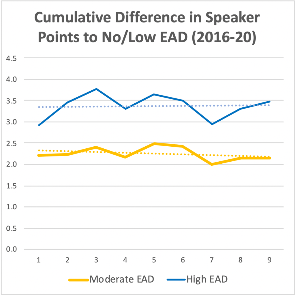 In our analysis concerning the performance gap, the trends in each of the five years were not consistent with each other. We analyzed moderate EAD and high EAD teams in each year as separate cases.[15] The yearly charts of the performance gap changed direction from round to round (decreasing gap to increasing gap, or vice versa) more often than not over 9 rounds (7 opportunities to change direction), so the following comments are based on the statistically generated liner trend lines. There were years where the gap (i.e., the trend line) decreased for both groups. In other years, the gap increased for both groups, or one group increased while the other decreased. In some cases, the line was essentially flat. Clearly, one reason for the fluctuation in these charts was that some topics played to the strengths of the EAD teams more than others.[16] For example, Round 7 at WUDC 2020 (“This House believes that ASEAN should abandon ‘the ASEAN Way’.”) had the lowest performance gap that year.[17] Aggregating the results over 5 years helps to factor out some of the noise due to particular motions, though the charts still fluctuated up and down considerably. The two charts shown here present the 5-year aggregated data, showing the performance gap tending to decrease slightly for moderate EAD teams and tending to increase slightly for high EAD teams. If we combine these two groups into one moderate/high EAD group, then the trend line suggests that over the course of nine rounds, the performance gap closes by about 0.1 speaker points. But if ex ante discrimination were driving these results, we would expect the gap to close more for high EAD teams than it does for moderate EAD teams. In fact, the trend line runs in the opposite (increasing) direction for high EAD teams.